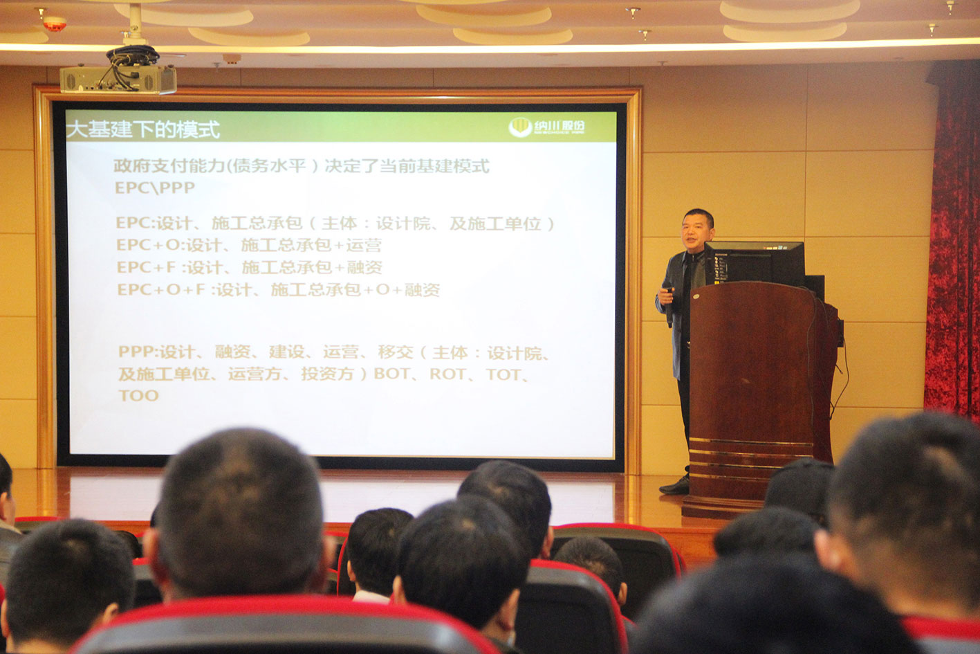 纳川股份董事长助理傅义营根据当前市场环境、结合国家对基础建设投资环境鼓励政策,对大基建下的模式和EPC、PPP模式不同的基建工程模式下,对应的雨污管网、城市给水的管道产品销售模式及配套的解决方案作了细致讲解。
