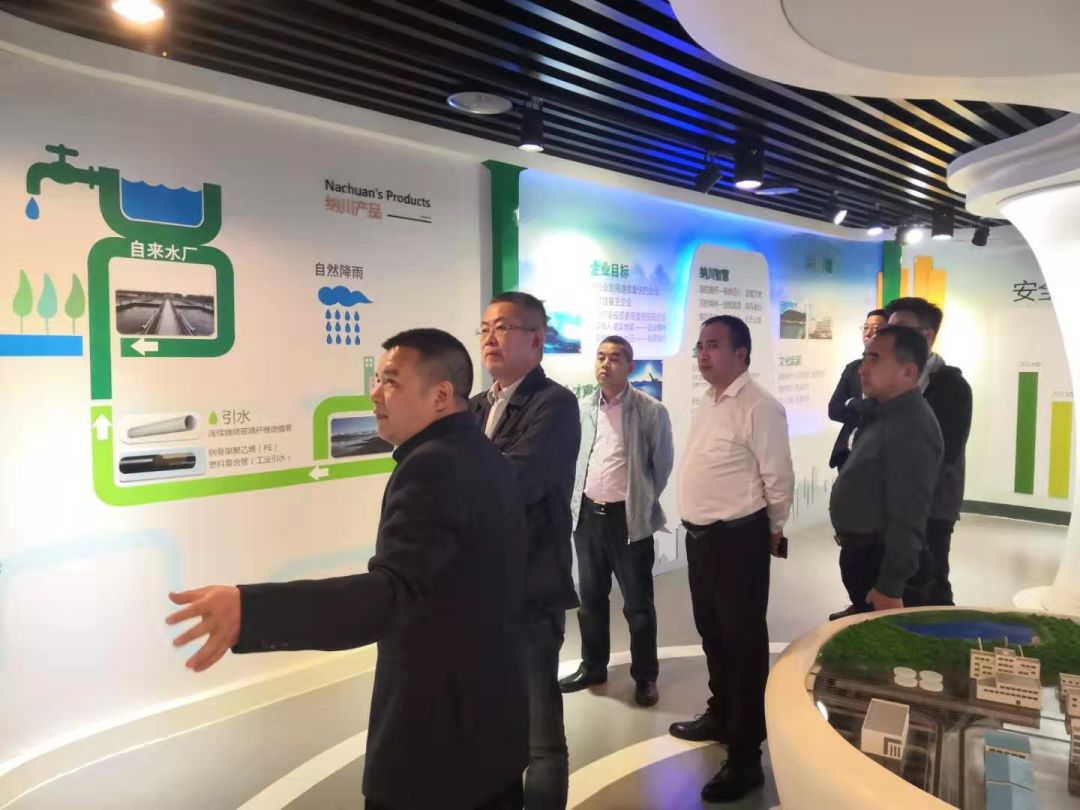 在纳川股份董事长助理、纳川基建总经理傅义营的陪同下,陕西水环境公司桂宏一行先后参观了纳川展厅和生产车间。
