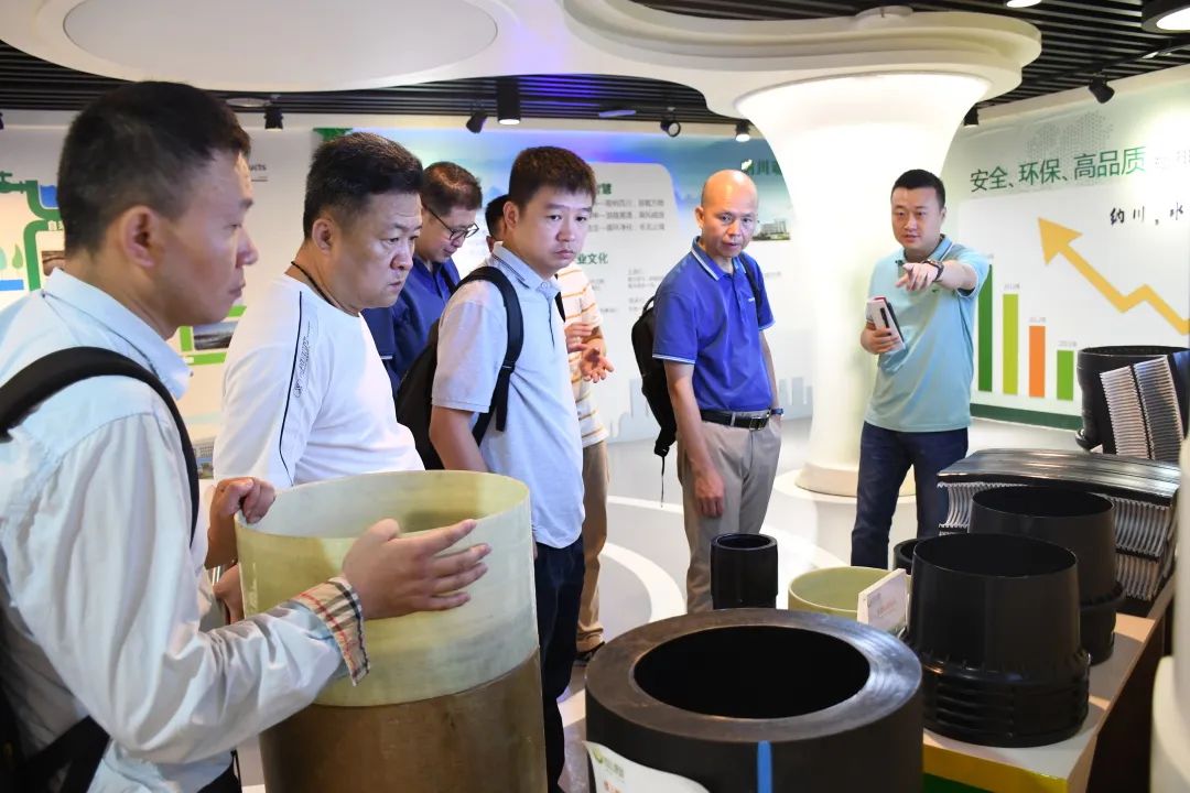 在公司展厅,能源交通国际事业部总监严立威向来访人员介绍公司发展历程、企业文化,对公司高密度聚乙烯(HDPE)缠绕结构壁管、钢骨架聚乙烯(PE)塑料复合管、聚酯增强复合顶管等主营产品技术攻关、应用案例进行详细讲解。