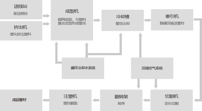 钢骨架聚乙烯塑料复合管采用连续缠绕、焊接成钢网骨架,塑料熔融挤出与骨架同步复合成型工艺。即以优质低碳钢丝为增强相,聚乙烯(PE)为基体,通过成型机将钢丝焊接成网,与熔融聚乙烯在复合机头内进行复合挤出,在生产线上连续复合成型,经冷却、牵引切割、封口,得到直管成品。